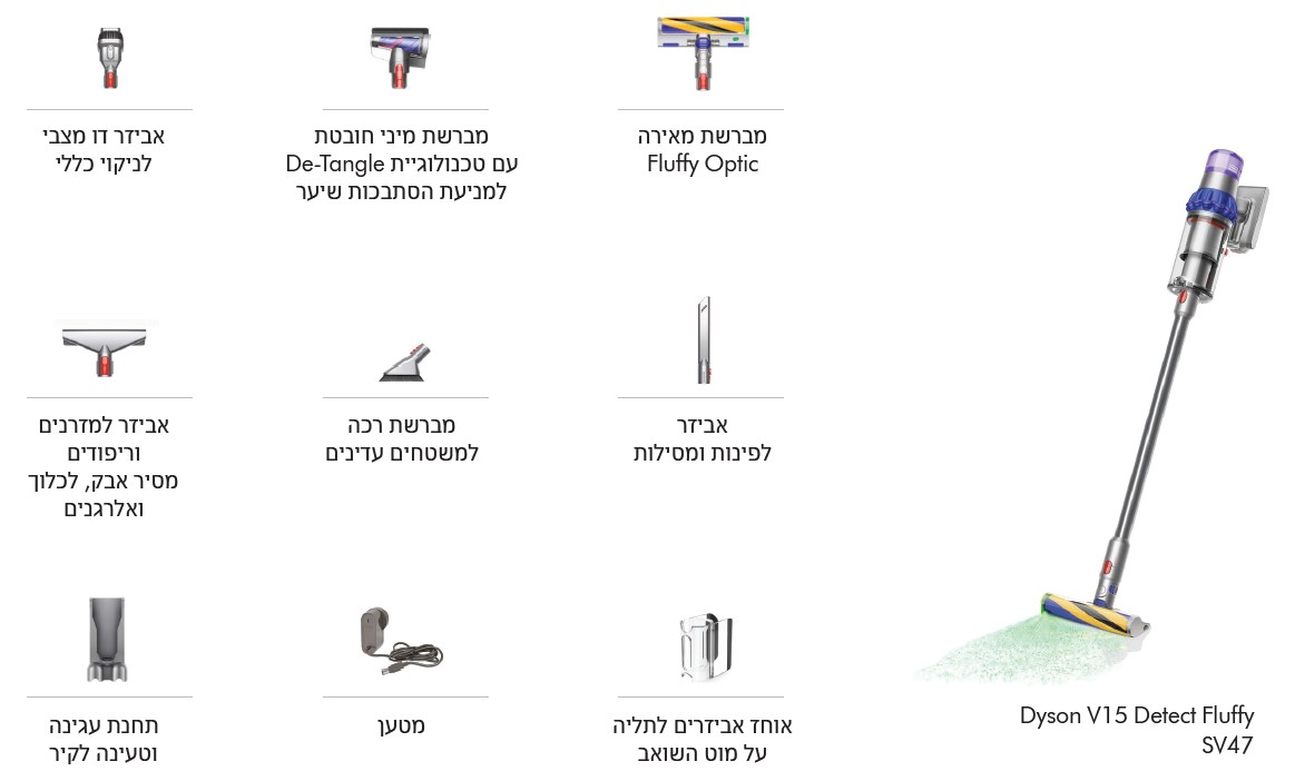 שואב אבק ידני אלחוטי כולל תאורת LED לגילוי אבק מיקרוסקופי Dyson דייסון v15 Detect Fluffy SV47