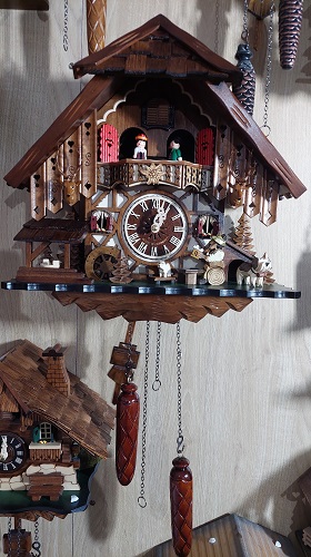 קוקיה קורא בשעה עם הד. לשעון תנועת סוללה עם כיבוי לילה אוטומטי. זמן ההפעלה של הסוללות הוא כשנה. המידה מתייחסת רק לשעון, ללא מטוטלת ומשקולות.