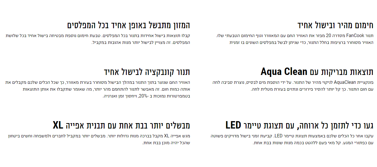 5 מפלסי אפייה | 8 פונקציות בישול | לניקוי מהיר Aqua Clean | מגש אפייה גדול יותר ב- 25% | גוף חימום עליון נשלף עבור ניקוי קל | כפתורי הפעלה נשלפים