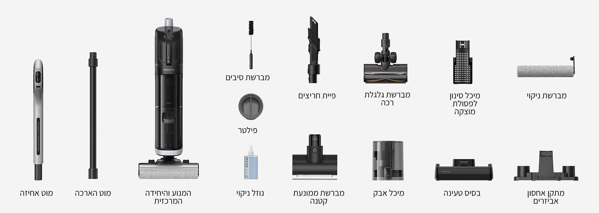 האבזור המלא כולל: מוט ומברשת ראשית לשאיבה ללא שטיפה , מברשת חובטת קטנה לניקוי ספות ומזרנים ומוט מסילות לניקוי מסילות ופינות