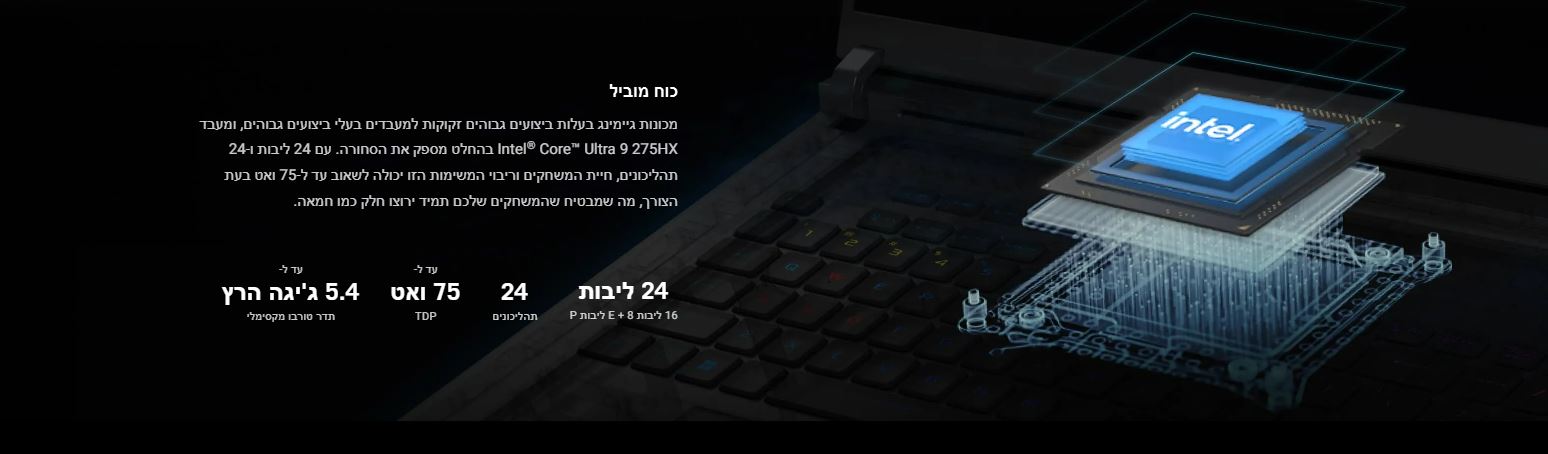 | מעבד | Intel® Core™ Ultra 9 Processor 275HX 2.7 GHz (36MB Cache, up to 5.4 GHz, 24 cores, 24 Threads); Intel® AI Boost NPU up to 13TOPS |