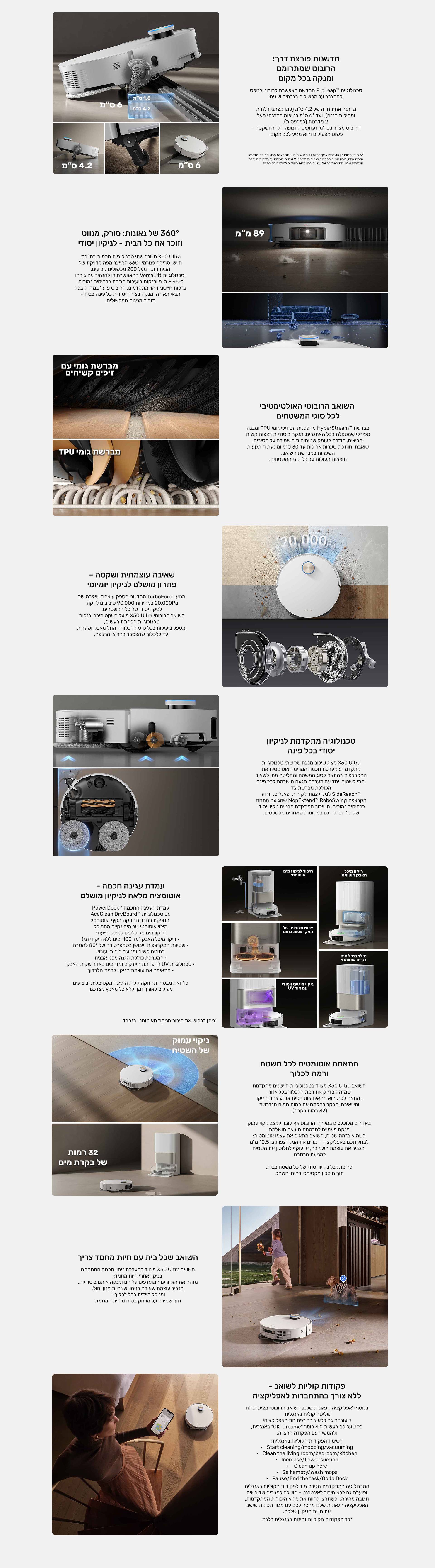 טכנולוגיית Pro-leap™- מטפס מעל 2 מדרגות בגובה עד 6 ס"מ או מעגל מדרגה בודדת בגובה עד 4.2 ס"מ טכנולוגיית ניווט ersa-lift – מנמיך את גובהו ל-8.95 ס"מ ולנקות ביעילות מתחת לרהיטים נמוכים. חיישן AI המזהה עד 200 מכשולים ב- ° 360 גם בחושך מברשת כפולה- מונעת הסתבכות שער ופרווה במברשת השואב פקודות קוליות לשואב- ללא צורך בהתחברות לאפליקציה