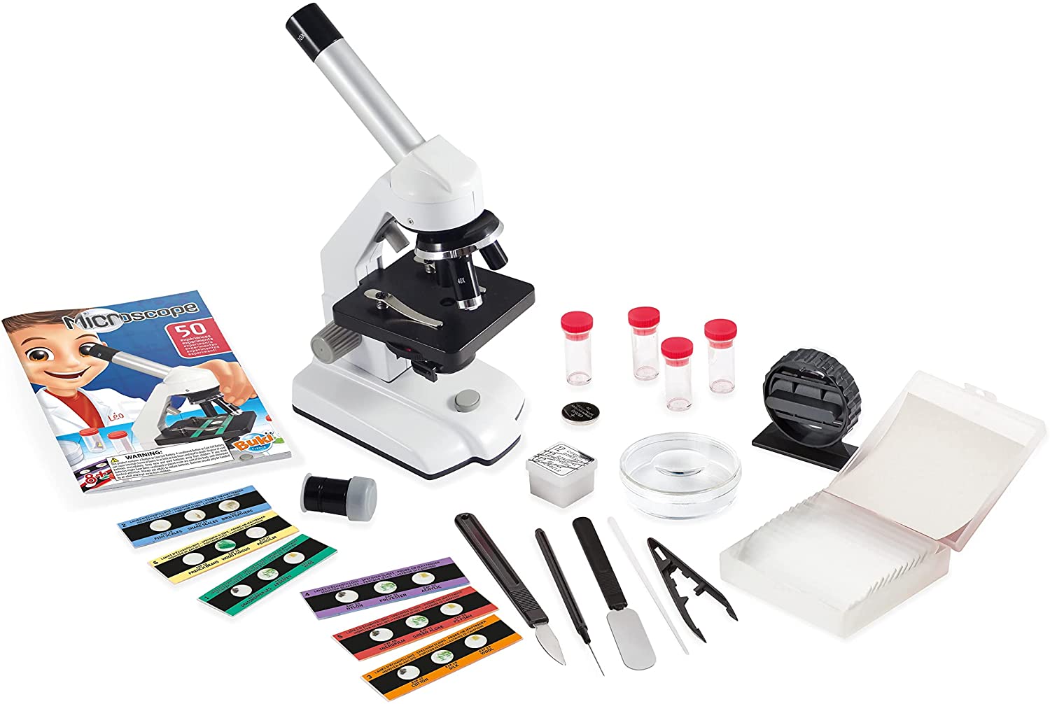 מיקרוסקופ לילדים BUKI אופטי עם הגדלה של עד X1000 מגיע עם סט אביזרי מחקר ודוגמיות ייחודיות יחד עם חוברת הוראות ובה 50 ניסויים מדעיים לביצוע עם המיקרוסקופ.