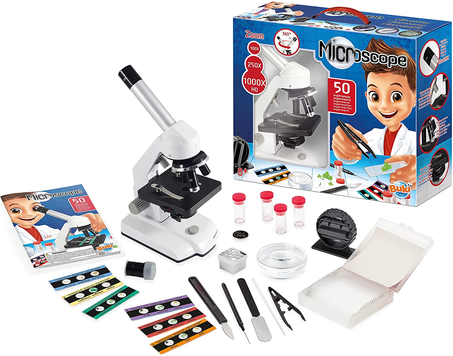 מיקרוסקופ לילדים BUKI X1000 עם תאורה עלית ותחתית מגיע עם ערכת מחקר מבית בוקי צרפת