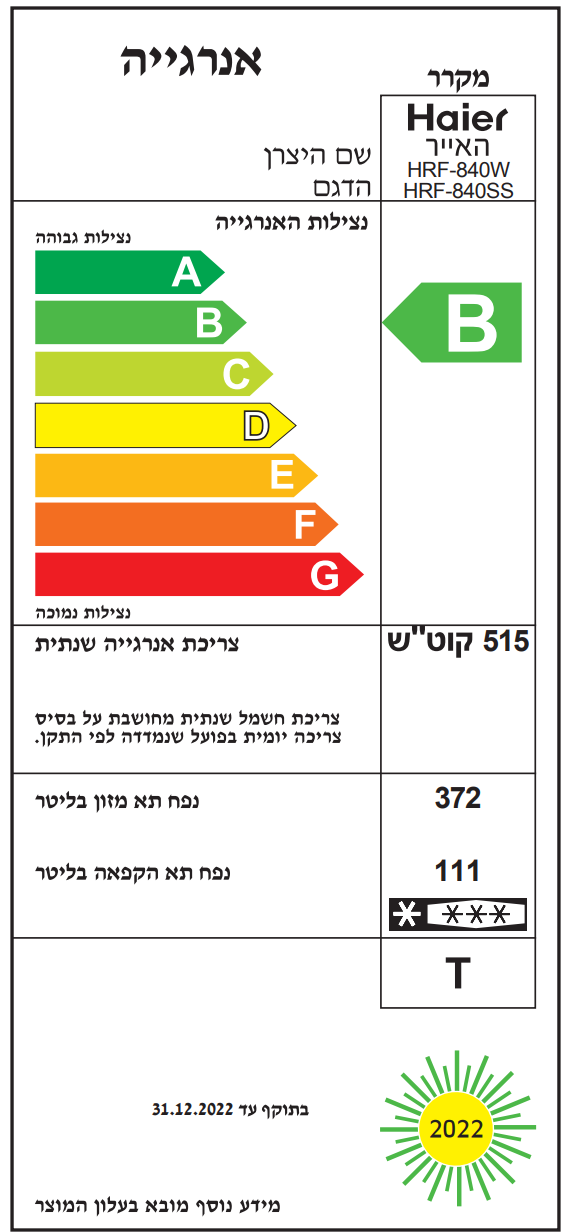 | מספר דלתות: | מקרר 2 דלתות מקפיא עליון |