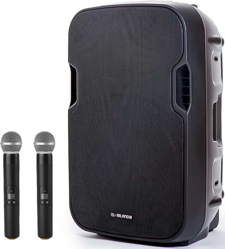 - QL900 בידורית 15 אינץ׳ עם נגן מדיה מובנה וזוג מיקרופונים אלחוטיים של