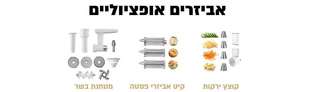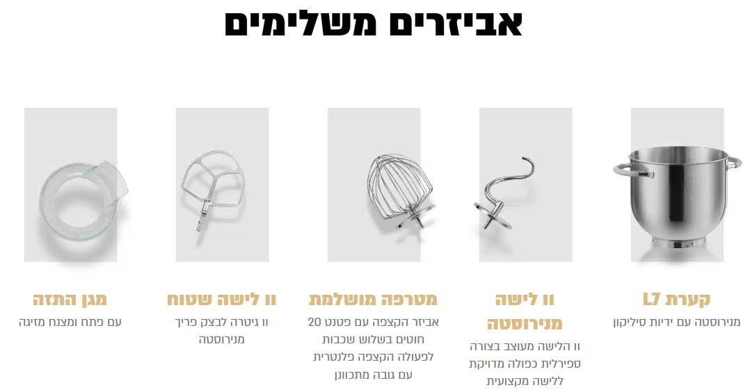 מידע נוסףהספק 1800W מנוע DCגיר מתכתעוצמת רעש 45 דציבל בלישהתצוגה דיגיטלית המראה זמן עבודה | מהירות | השהייה | טיימרזמן עבודה רציף 60 דק’מומחיות – חלות | לחמים | עוגות | מאפים | הקצפותקערת נירוסטה בנפח 7 ל’ עם ידיות סיליקוןקערה אופציונאלית בנפח 8 ל’כמות בצק לעבודה 3 ק"ג בצק4 ק"ג בצק בקערה ייעודית בנפח 8 ל’