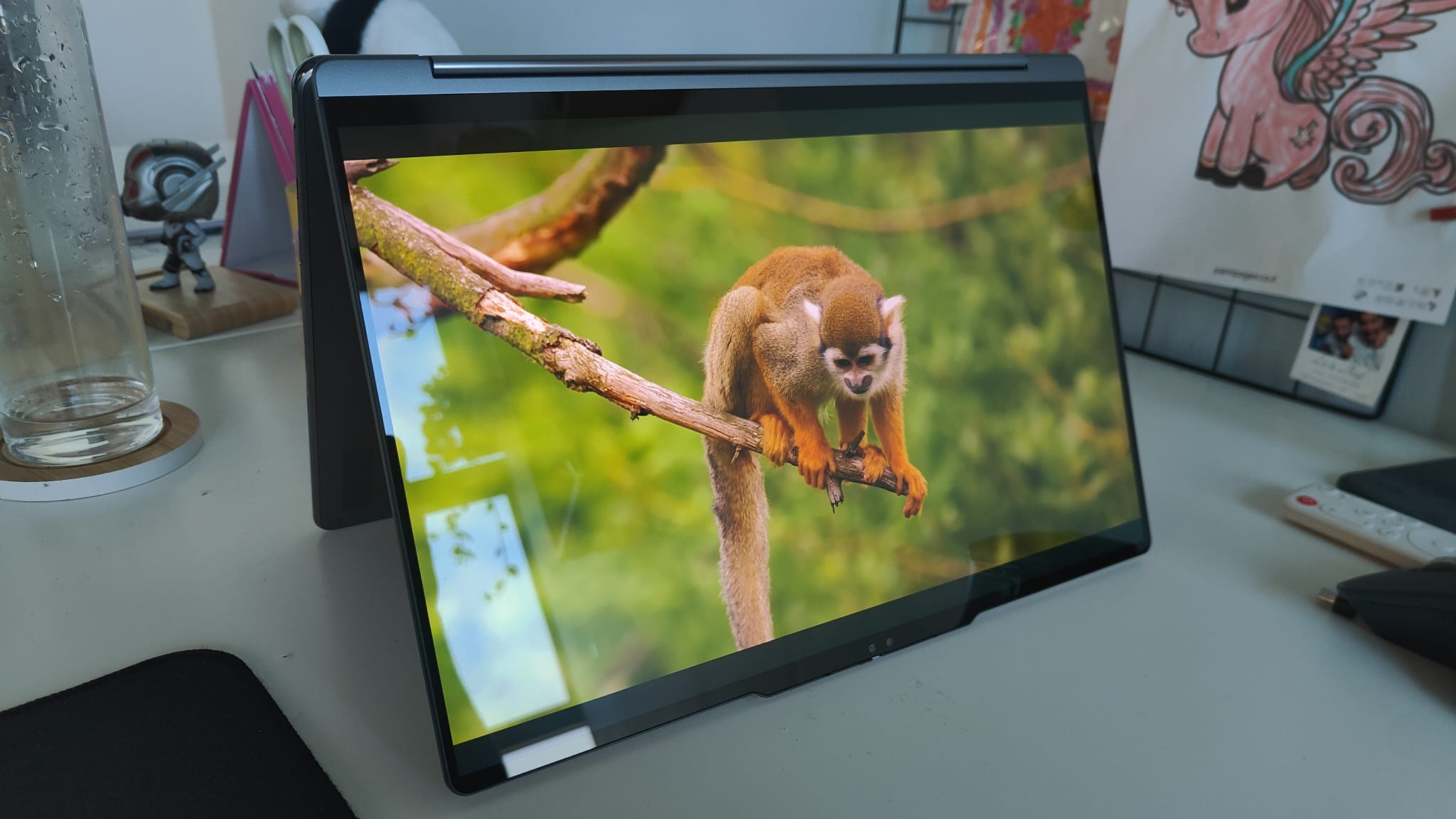 המפרט של מסך ה-Yoga 9 מרשים, לפחות על הנייר: תצוגת OLED, רזולוציה 4K או ליתר דיוק, 3840X2400 פיקסלים, בהירות מקסימלית בעוצמה 600nits ב-HDR ועד 400nits בתצוגה סטנדרטית, כיסוי צבעים 100% DCI-P3 וניגודיות ביחס של 100,000:1. קצב הרענון מצנן את ההתלהבות עם תדר של 60 הרץ בלבד והציפוי המבריק שהולבש על מסך המגע מחזיר השתקפויות בלי סוף - ולפעמים גם הבהירות המקסימלית לא תמיד עוזרת.