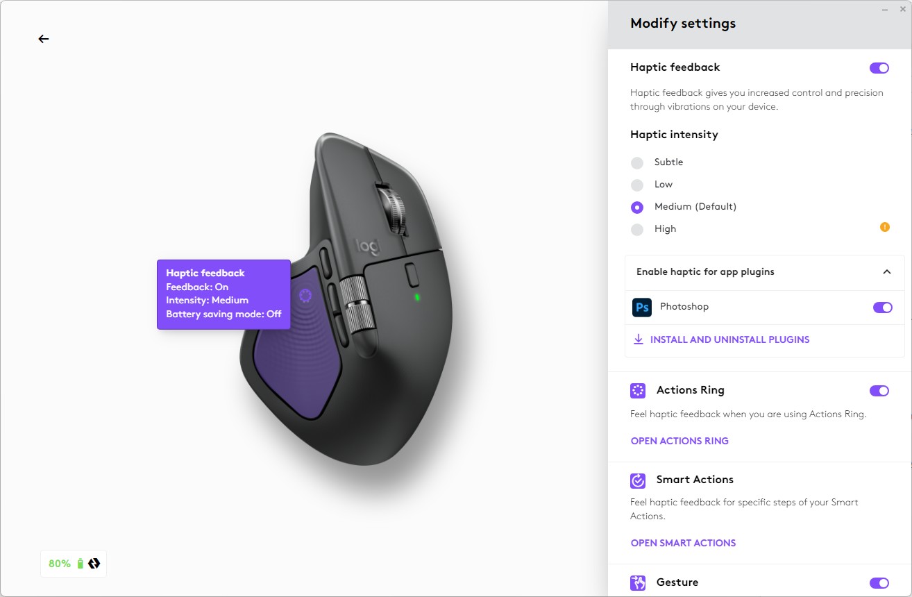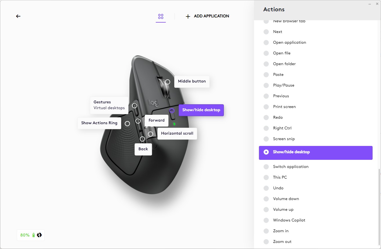 אחד מהשינויים המשמעותיים בעכבר שלפנינו היא תוספת המשוב ברטט: מדובר במשטח רחב, זה שעליו נח האגודל, המשמש לפתיחת ה-Actions Ring; שמונה פקודות שניתן להפעיל ישירות מהעכבר. בברירת המחדל העכבר מציע בין היתר פתיחת תפריט אימוג'יז, הפעלת נגן וביצוע צילום מסך, אבל את כל אלה אפשר לשנות למגוון פקודות שונה לחלוטין - בהתאם לאופי השימוש שלכם. אנחנו למשל העדפנו להחליף חלק מהפקודות ל"העתק" ו"הדבק", הצגת שולחן העבודה ופתיחת תיקייה ספציפית. המשוב ברטט מתבטא בכל פעם כשפותחים את ה-Actions Ring אבל גם במעבר בין הפקודות - ואפשר גם לכבות את הרטט אם תעדיפו לחסוך בחיי סוללה.