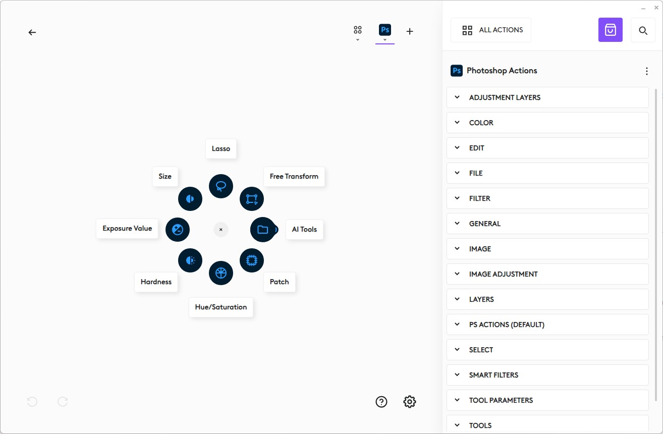 ה-Actions Ring הופך למתוחכם באמת כשהוא מותאם לתוכנות ייעודיות: בתוכנת עריכת הוידאו CapCut למשל קבענו סט פקודות ייעודי שרלוונטי לשימוש המקצועי שלנו. כך למשל פקודות רגעיות כמו גזירה ותפריט אימוג'יז, הפכו להפעלה זריזה בעזרת העכבר. בתוכנת פוטושופ, שלה ספציפית ב-Logtiech דאגו לפלאג-אין ייעודי, סט פקודות ב-Actions Ring כבר היה מוכן ובין היתר כלל את כלי הלאסו, שליטה על החשיפה וה-Hue/Saturation וכדומה - ואת כולם ניתן כמובן להחליף ביתר פקודות הרבות שמציעה התוכנה. אהבנו גם שב +Options יש פרופילים מוכנים לשלוש קטגוריות, בין אם זה לפקודות פופולריות (Essentials), כאלה שעוסקים יותר בצורות ויצירה מאפס (Paths & Vectors) או לעריכת תמונות (Retouch). התחשבות נאה במעצבים ועורכים.