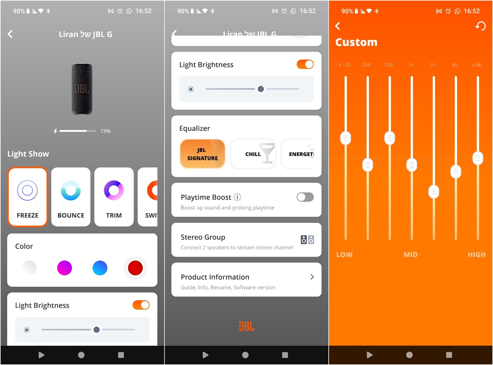 את חיי הסוללה האידיאליים ביותר שב-JBL הבטיחו לנו, השגנו בתנאים די סגפניים: הווליום היה על 30%, התאורה כבויה ותכונת PlayTime Boost פעלה. רק אז הסוללה איבדה 7-8% בשעת האזנה. לטעמנו זה עדיין יותר ממספיק לצורך הסטנדרטי שה-Grip צפוי למלא; מסיבת בריכה קטנה, הפעלה לילדים או כרמקול בחצר. גם כשהקפצנו את עוצמת הסאונד ל-70% והפעלנו את התאורה בבהירות מלאה, עדיין נהננו מכמה שעות טובות של האזנה מבלי שחששנו שה-Grip ידרוש טעינה - וזה מספיק טוב לשימוש פרטי.