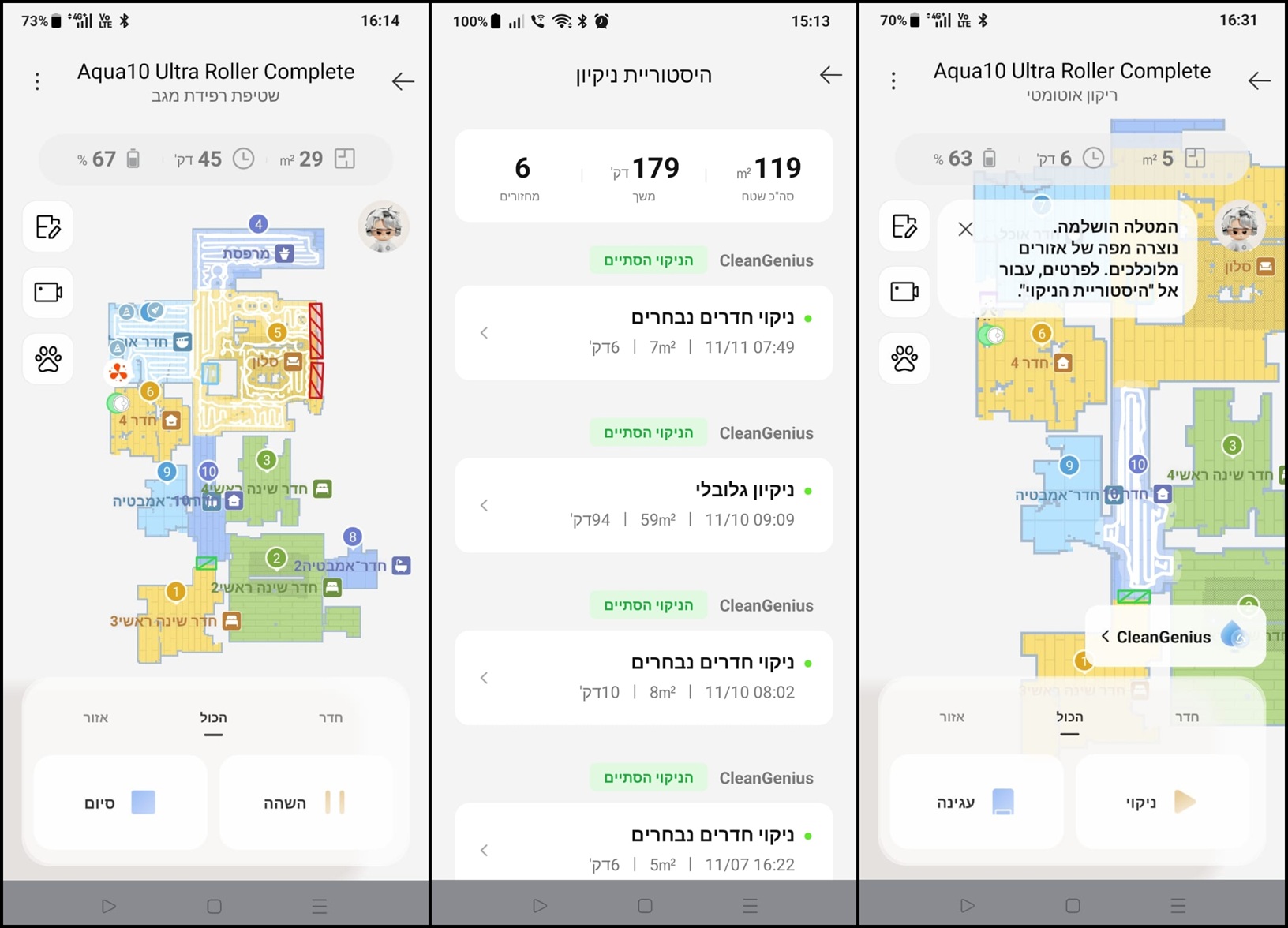 - שאיבה ושטיפת מסדרון בשטח 5 מ"ר, במצב CleanGenius, ארך 6 דקות וניצל 6% סוללה.