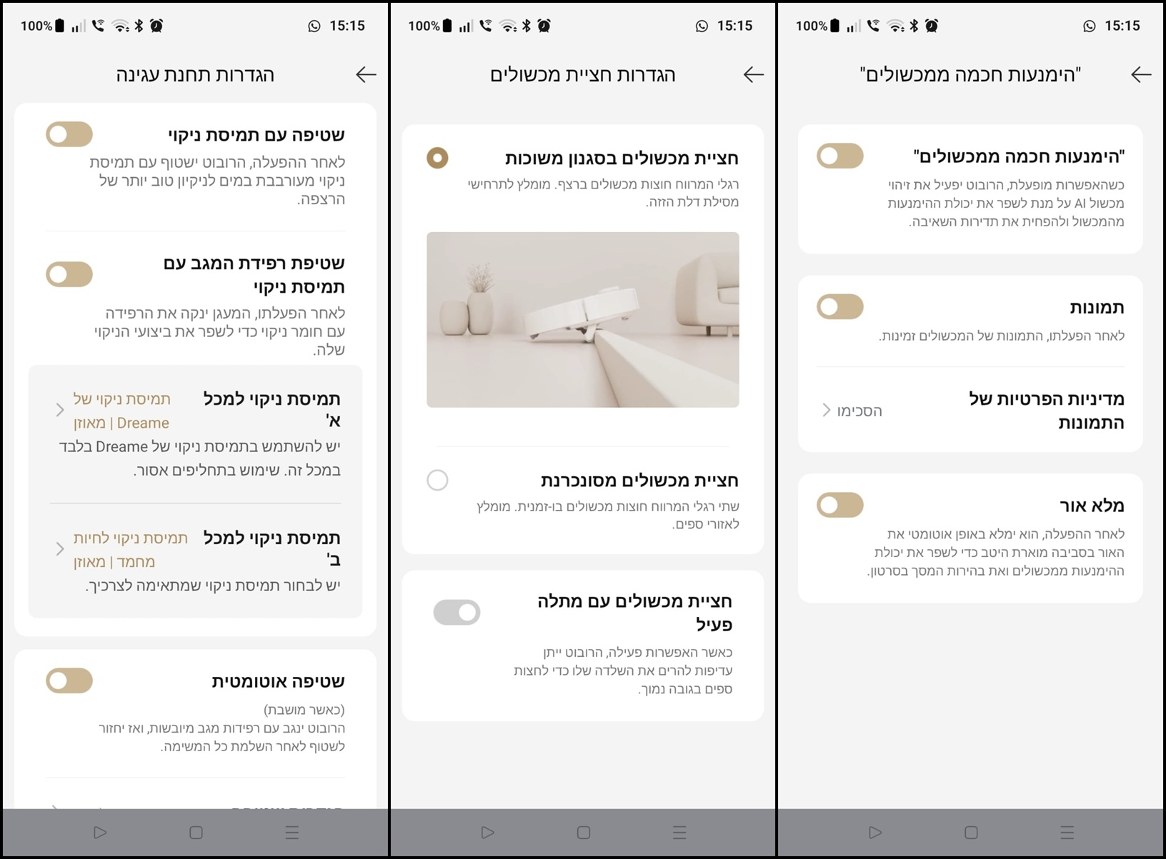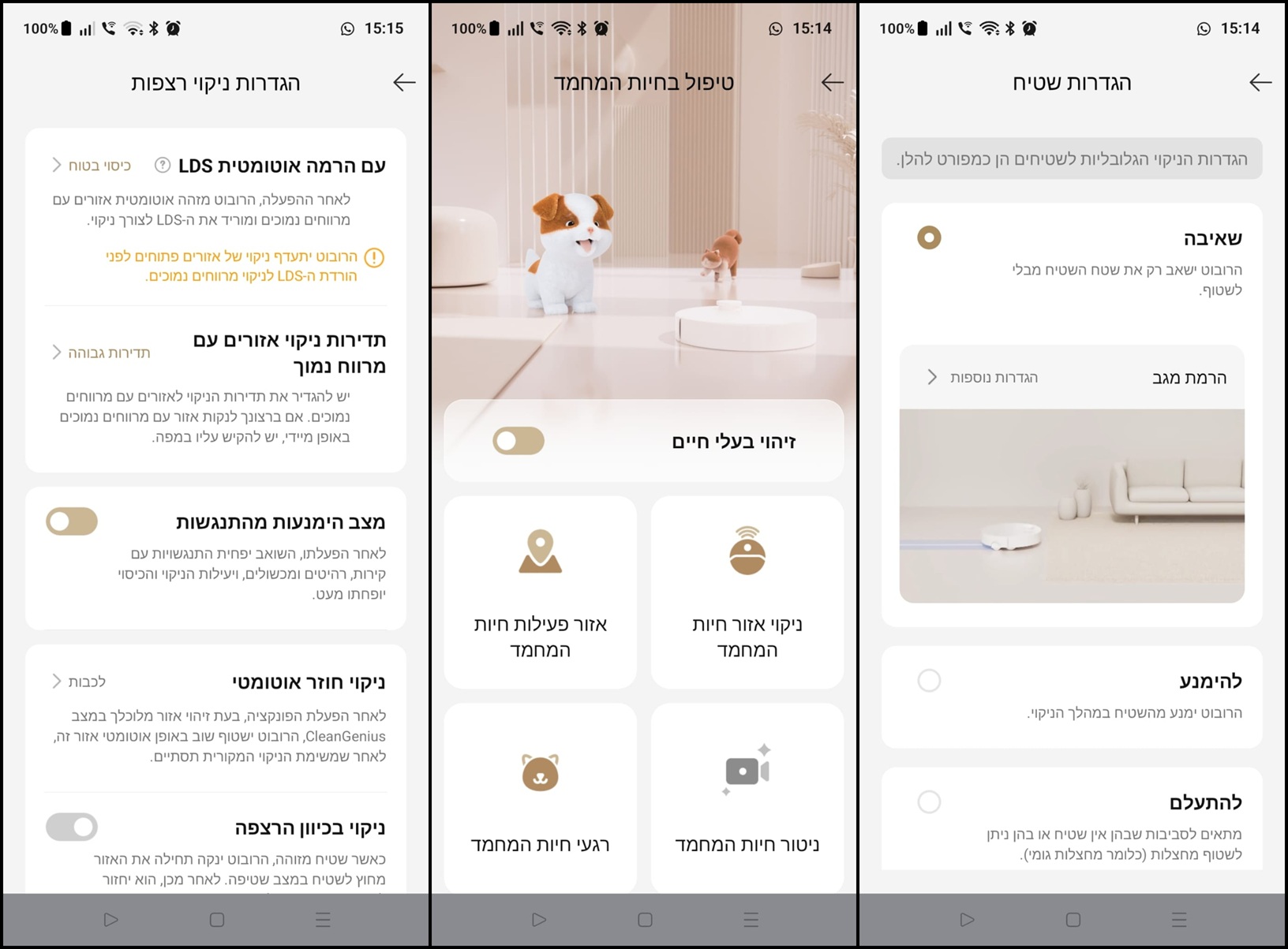 - שאיבת ושטיפת חדר שינה בשטח 11 מ"ר, במצב CleanGenius בתוספת "ניקוי עמוק", ארך 18 דקות וניצל 22% סוללה.