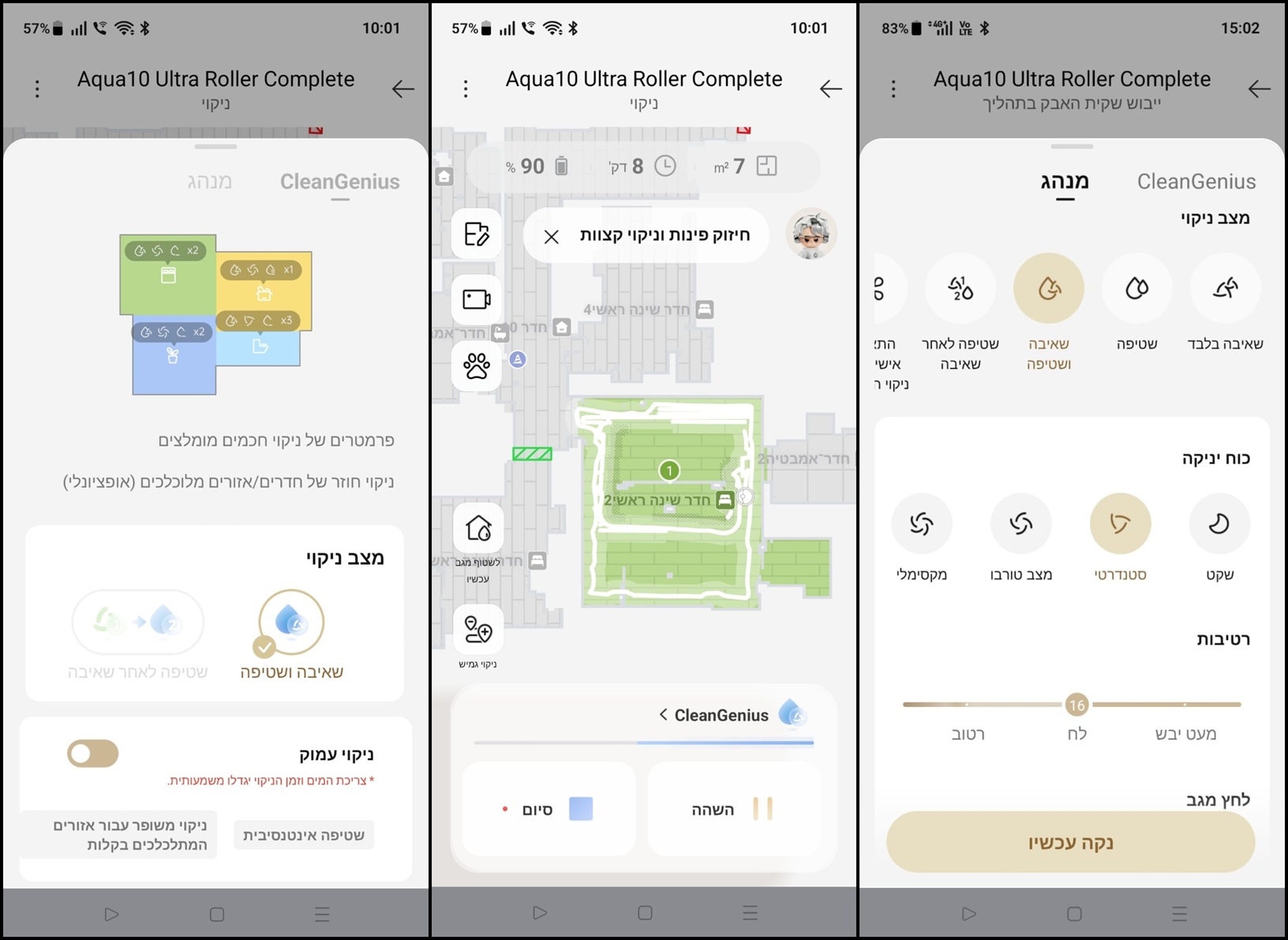 מבחינת אפשרויות שאיבה, באפליקציה ניתן לבחור בין שני מצבי שאיבה: הראשון הוא CleanGenius האוטומטי, שמעביר את המושכות לחיישני הרובוט שמזהים לכלוך ברחבי הבית וה-Aqua 10 Ultra מנקה על פי הצורך. המצב השני ידני: ניתן לבחור כוח יניקה מתוך 4 רמות (שקט, סטנדרטי, טורבו ומקסימלי) ובין שני סוגי מסלול שקובעים את רמת היסודיות (מהיר וסטנדרטי).