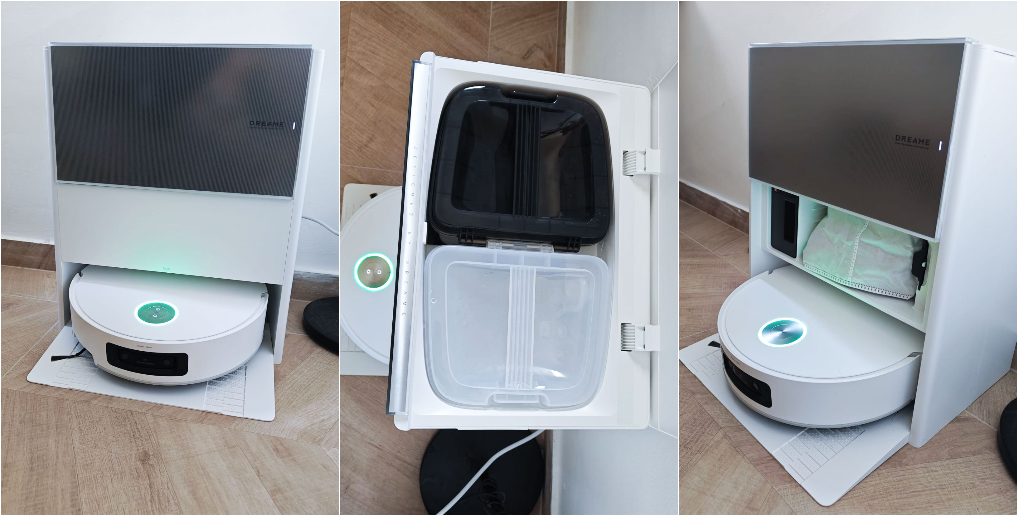 עמדת הטעינה של ה-Aqua 10 Ultra כוללת שני מיכלי מים: מיכל המים הנקיים נפחו 4 ליטר ומיכל המים המלוכלכים נפחו 3.5 ליטר. שני המיכלים מוסתרים על ידי דלת לבנה ובמראה נקי, בונוס נחמד שמקל על ההחלטה לשלב את התחנה בסלון מבלי לחשוש מדליפת ריחות לא נעימים. בקדמת התחנה דלת נשלפת שחושפת מיכל אחסון לשקית אבק שאמור להספיק ל-100 ימי שימוש. לצידה שני תאים קטנים לאחסון נוזל הניקוי, האחד מיועד לנוזל ניקיון כללי והשני לנוזל נטרול ריח מחיות מחמד.