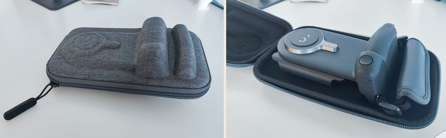 נתחיל מהאביזר המרכזי: ה-ProGrip נראה כמו גריפ של מצלמת DSLR סטנדרטית: יש לו את המנח המקובל לכף היד, האצבע המורה ממוקמת בטבעיות מעל כפתור השחרור ומרקם מחוספס מלווה את האזורים שעלולים להחליק בזמן שימוש, כמו כרית כף היד והאזור בו נח האגודל. לאורך הגריפ תאורה קטנה שמעידה על סטטוס הסוללה וכן על צימוד וסטטוס טעינה של הגריפ. בהמשך ה-ProGrip תושבת להנחת הסמארטפון לרוחב - וניתן לסובב אותה ולצלם גם לאורך. מאחורי התושבת שני מקשים קטנים, אחד עבור אתחול צימוד הבלוטות' והשני להפעלת/ביטול הטעינה האלחוטית. מבחינת תאימות, התושבת מתאימה לסמארטפונים ברוחב שבין 5.8-9 ס"מ עם/בלי קייס ובמארז קיבלנו גם מתאמים עבור מכשירים קטנים במיוחד.