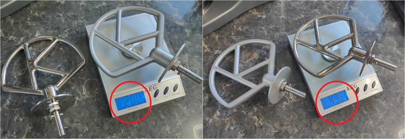 (40% מהציון הסופי)הקערה עשויה נירוסטה כמקובל והאביזרים עשויים כנראה מנירוסטה ואולי גם ציפוי אלומיניום - היצרנית לא מצהירה רשמית. נוסיף שמאחר ויש לנו דגם דומה וישן בהרבה מבית Kenwood גם כן, מתבקש היה לבצע השוואה בין האביזרים: בזמן שוו הלישה ובלון ההקצפה של שני הדגמים זהים בנראות וכמעט גם במשקל, המערבל K-Beater "השמין" משמעותית: מלבד הציפוי המבריק שהתווסף לו, משקלו קפץ אסטרונומית, מ-200 גרם בגרסה הקודמת ל-498 גרם - נתון שכנראה מעיד על התמודדות יעילה יותר בנפחי עבודה גדולים ואולי גם מרמז על עמידות לאורך שנים.