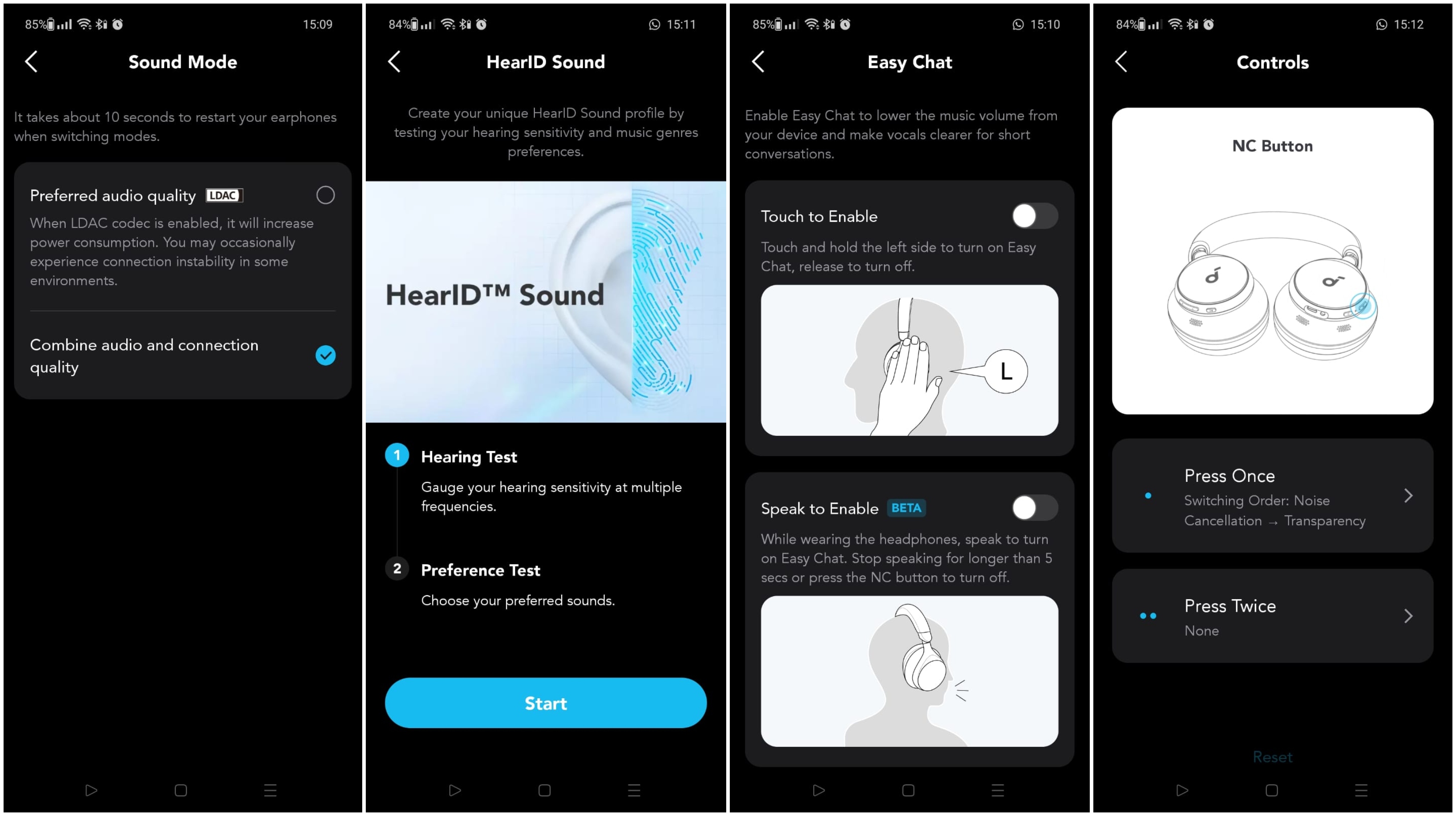 (40% מהציון הסופי)במפרט הטכני: דרייברים בקוטר 40 מ"מ, תמיכה בפורמט Hi-Res Audio ובמקודד LDAC וכמובן, בתמיכת 4 מיקרופונים זמינים מצב שקיפות וביטול רעשים אקטיבי המוצע בכמה גרסאות – אבל נגיע לזה. נפתח באיכות הסאונד: האוזניות מגיעות עם חתימת הסאונד של Soundcore והיא לא רעה בכלל; היא סולידית באופייה, כלומר הטווחים מאוד מאוזנים ופירוט מספק, אבל מי שמחפש ביטוי יותר משמעותי ל-Vocals או לטווחים הנמוכים למשל, יימצא את מבוקשו בתכונת ה-BassUp המובנית באוזניות או דרך האקולייזר שזמין באפליקציה. מלבד האפשרות לקבוע בעצמנו את נוכחות התדרים ולשמור את ההעדפה כפרופיל, זמינים גם תבניות מוכנות כמו Deep ,Dance ,Bass Booster וכו' – שגם משפיעים משמעותית על פרופיל הסאונד.
