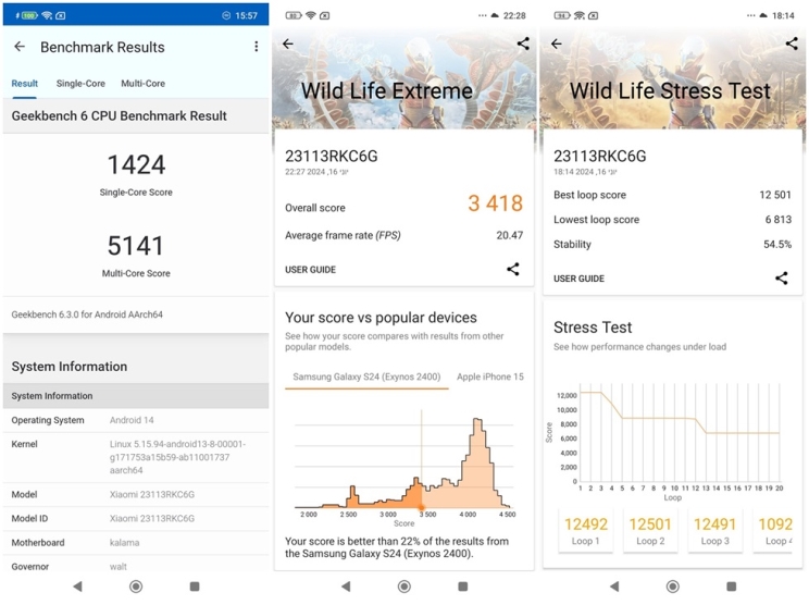 הביצועים הוכיחו את עצמם. ה-Poco F6 Pro לא יגמגם לכם, לא במשימות סתמיות כמו כשתשלחו ווטסאפ, תאזינו במקביל לספוטיפיי ותעברו מהר לרשת החברתית שלכם - וגם לא בזמני גיימינג תובעניים. ב-Geekbench קיבלנו 5141 נקודות מכובדות מאוד ב-Multi-Core ובבדיקת הגיימינג Wild Life Extreme קיבלנו 3418 נקודות - שדי מקבילים לתוצאות של שבב ה-Exynos 2400, זה שתמצאו ב-Samsung Galaxy S24. מרשים.