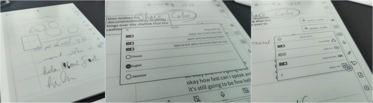 (40% מהציון הסופי)למחברת מסך בגודל 10.3 אינץ' עם תצוגת Carta 1200 מונוכרומטית מבוססת על E-ink, עם רזולוציה מקסימלית של 1860X2480 פיקסלים ופיזור פיקסלים של ppi300 התומכת ב-16 גווני אפור. בדומה לתצוגות מבוססות דיו אלקטרוני, גם כאן אין תאורה אחורית והרגשת הקריאה היא אכן כשל נייר אמיתי, על יתרונותיו וחסרונותיו. תצוגת ה-E-ink ותופעת ghosting הידועה לשמצה שמתלווה אליה לא פוסחת על ה-Boox GO 10.3; דפדפנו בין העמודים ו"עקבות" של המסך הקודם הקפידו להיטמע במסך הנוכחי. בדרך כלל זה לא מפריע - ולפעמים היו רגעים שממש חיכינו שהשאריות של הדף הקודם ייעלמו. הממשק אמנם מציע ארבעה קצבי ריענון עבור צרכים שונים שיצמצמו את ה-ghosting, ואכן חלקם עוזרים במעט – אבל העובדה שצריך להתאים כמעט בכל פעם קצב ריענון שונה בהתאם לצורך המתחלף, הופכת את העניין למסורבל.
