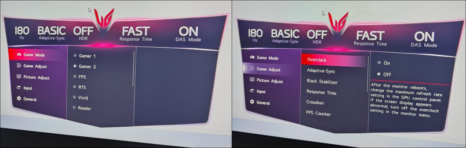 (35% מהציון הסופי)ה-27GS75QB מצויד בכמה כלי גיימינג מתקדמים כשבראשם קצב ריענון בתדר 180 הרץ וזמן תגובה של 1ms ב-GtG - צמד תכונות תחרותיות שיידרשו בעיקר משחקים מהירים. את קצב הרענון אגב, אפשר גם לסחוט לתדר 200 הרץ עם Overclock דרך התפריט המובנה במסך. ב-LG מזהירים שזה עלול לגרום לריצודים וממליצים לבטל את התכונה מן הסתם במידה וזה מתרחש, אם כי במקרה האישי שלנו לא חווינו שום בעיות.