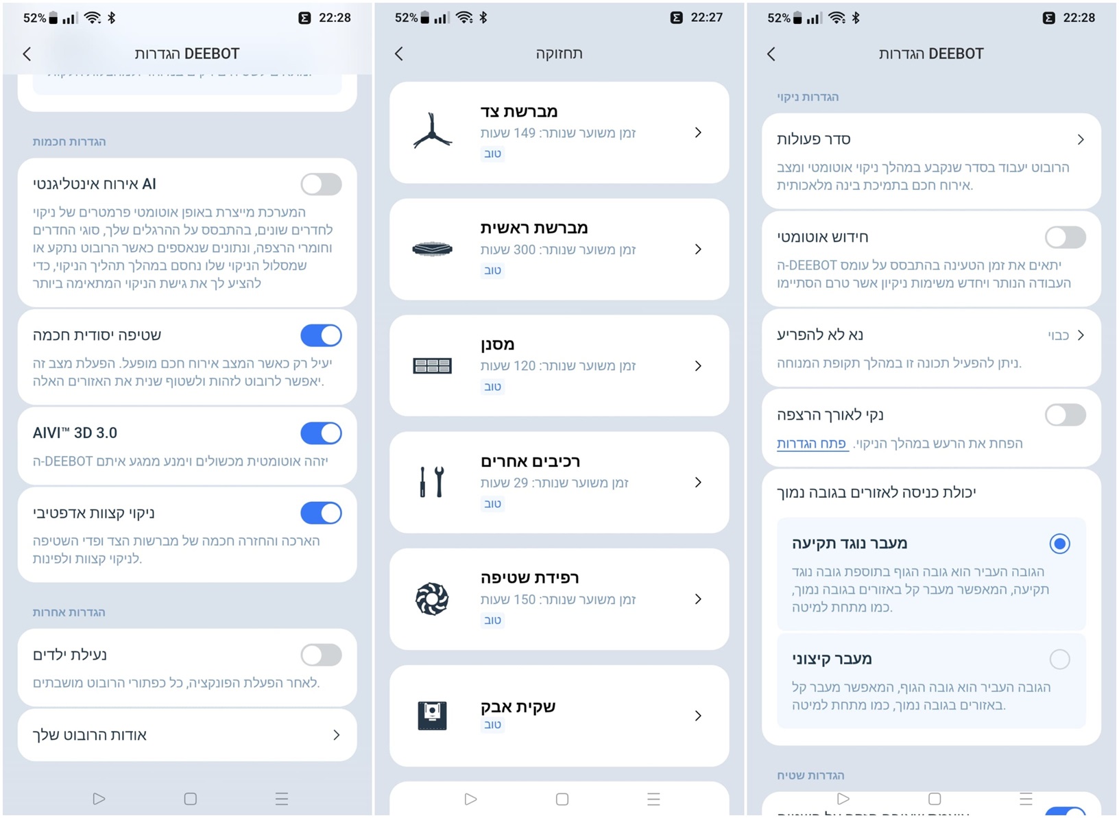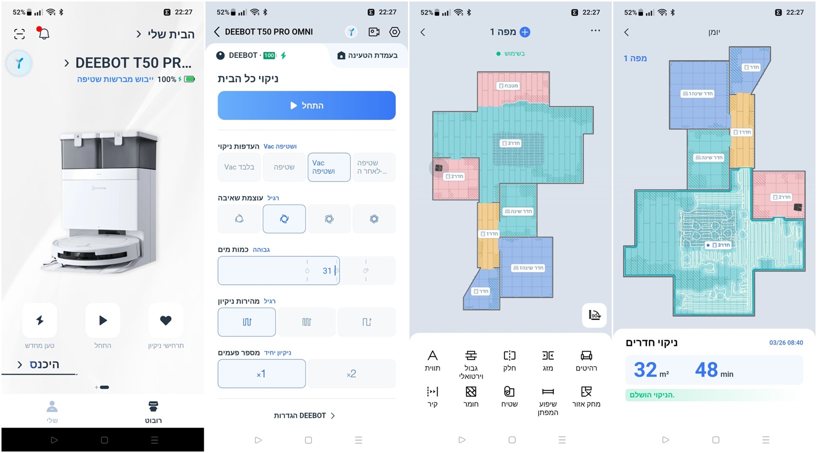 (35% מהציון הסופי)עוצמת השאיבה המקסימלית עומדת על 15,000Pa ובאפליקציה זמינים ארבעה מצבים: שאיבה בלבד, שטיפה בלבד, שאיבה ושטיפה במקביל וכן שאיבה ולאחר מכן שטיפה. ארבע עוצמות שאיבה מציע ה-T50 Pro omni: שקט, רגיל, מקסימום ומקסימום פלוס, כשהרמה האחרונה מן הסתם העוצמתית ביותר, אבל גם זללנית הסוללה הכי גדולה והיא גם המרעישה מכולם. ניתן גם לשלוט על מהירות הניקיון, מתוך שלוש רמות: יעיל, רגיל ועמוק, כשמן הסתם הרמה האחרונה תספק את הניווט הכי ממושך אך גם היסודי מכולם. מבחינת שטיפה, ניתן לשלוט ידנית על כמות המים, בטווח שנע בין 0-50.