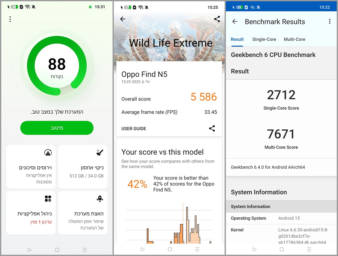 בשימוש היום-יומי, זה שכלל ניווט בן 20-30 דקות, פתיחת מיילים והודעות ווטסאפ לאורך היום, ה-Find N5 מגיע בקלות ליום סוף היום עם 50-60%. קחו בחשבון שברגע שהמכשיר במצב פתוח, קצב הזלילה מואץ בצורה מורגשת. קצב פריקת הסוללה משתנה מן הסתם משימוש לשימוש, אבל מרגישים בבירור שהסוללה מושפעת מהמסך הגדול.