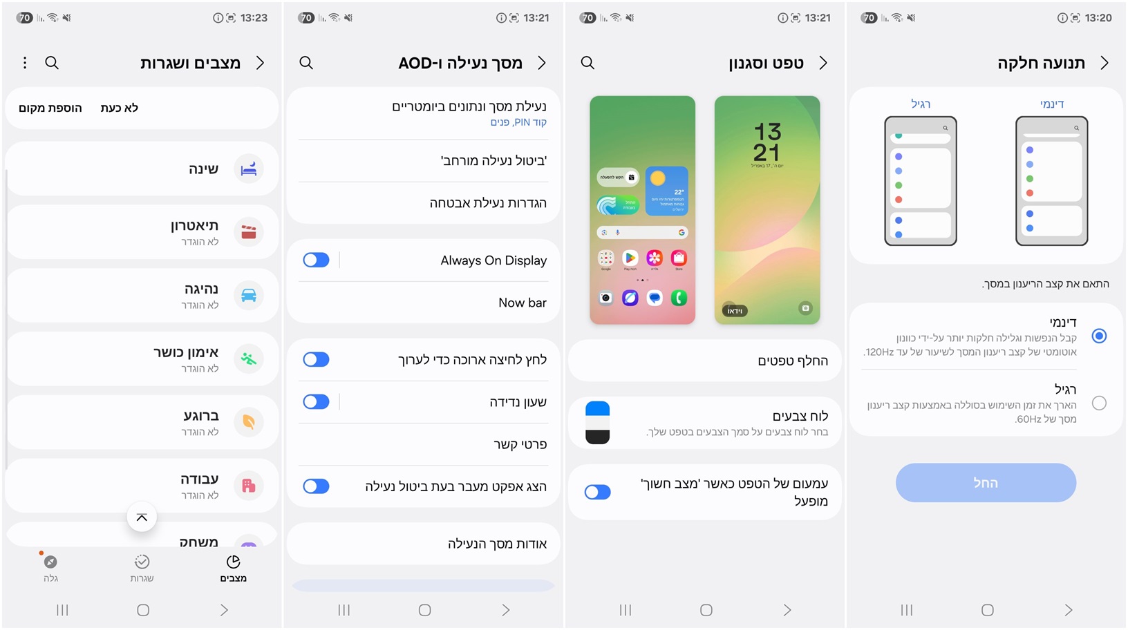 מסך ה-6.7 אינץ' מלווה בתצוגת Super AMOLED עם תמיכה ב +HDR10, קצב ריענון 120 הרץ ובהירות 1200nits במצב בהירות גבוהה. יחס הגוף/תצוגה עומד על 87.7% סבירים בלבד והשול התחתון הוא הבולט מכולם, כמעט כפול בעוביו מהיתר. התצוגה מרהיבה, בעיקר הודות לשילוש הקודש: בהירות גבוהה, עושר הצבעים וחדות התצוגה. בין אם זה גיימינג או צפייה בתכני נטפליקס, יצאנו מאוד מרוצים. את קצב הריענון השארנו על דינמי כדי שנהנה מ-120 הרץ, אבל גם ניתן לבחור ב"רגיל" שיוריד את קצב הריענון ל-60 הרץ, בתמורה לחיי סוללה עדיפים. בממשק ניתן לשחק עם טמפ' התצוגה כמקובל, להגדיר את איזון הצבעים והרוויה או להחליף ממצב "ססגוני" בברירת המחדל ל"טבעי" המאופיין בגוונים אנמיים אך מציאותיים יותר. הרזולוציה של התצוגה עומדת על 2340X1080 פיקסלים ולצערנו לא ניתן לשנות אותה.