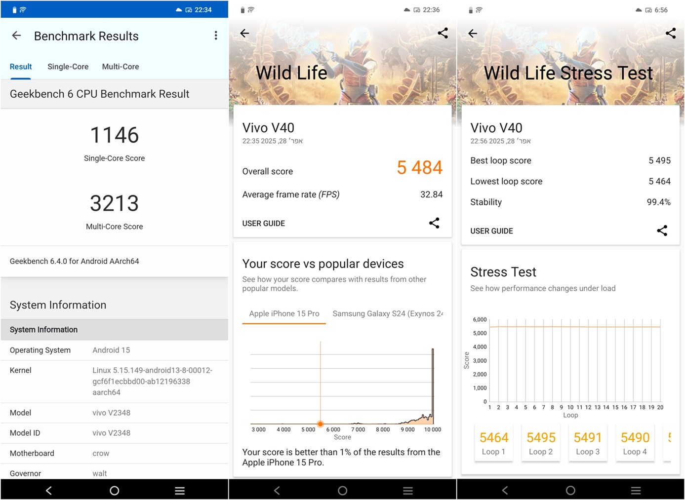 (10% מהציון הסופי)סוללה בקיבולת 5500mAh תומכת בטעינה מהירה בהספק של עד 80W ובקופסה קיבלנו מטען מקורי בהספק זהה. ה-V40 5Gתומך בטעינה הפוכה, אבל בדומה לרוב מוחץ של מכשירי הביניים, אינו תומך בטעינה אלחוטית. לפחות מהירות הטעינה מסחררת; בתום 30 דקות טעינה צברנו 68% אחוזי סוללה. טעינה מלאה ארכה 43 דקות – תוצאה מצוינת.