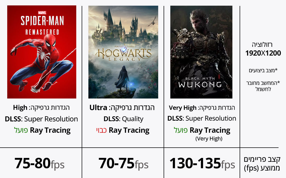 הרצנו במחשב שלושה כותרים: Hogwarts Legacy, Marvel's Spider-Man Remastered ו-Black Myth Wukong. כל המשחקים פעלו כשהמעבד במצב "ביצועים" והמחשב היה מחובר לחשמל.