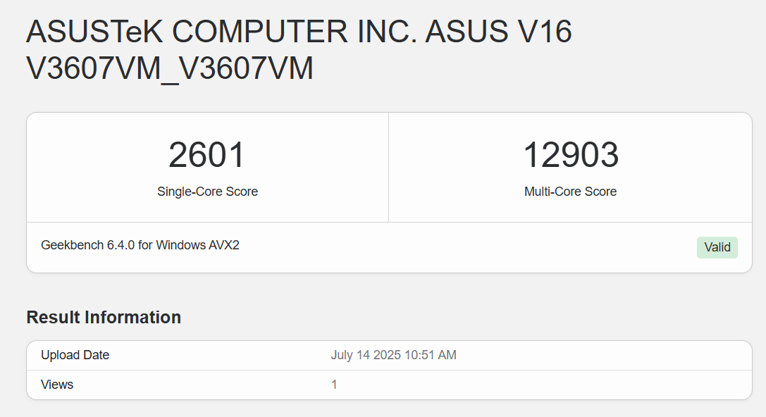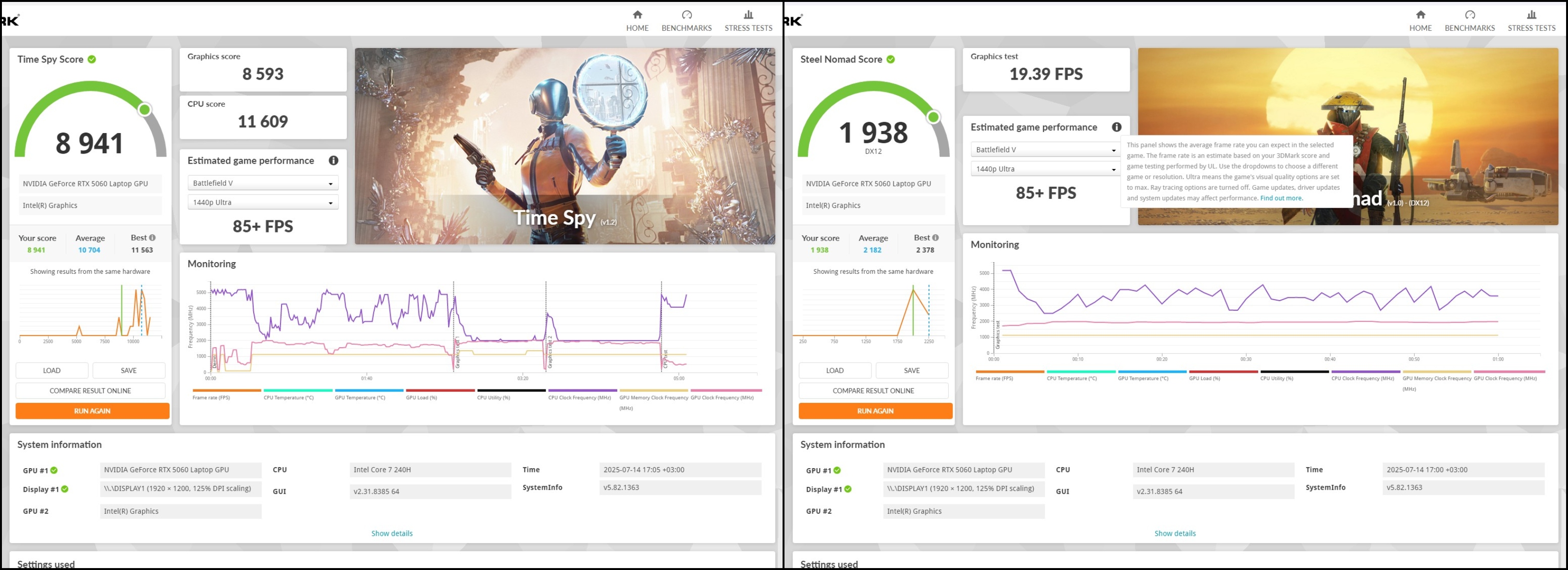 נתחיל עם המבחנים הסינתטיים: ב-Geekbench קיבלנו 12903 נקודות בריבוי ליבות - תוצאה מצוינת. במבחני הגיימינג של 3DMark קיבלנו 1938 נקודות ב-Steel Nomad ו-8941 נקודות ב-Time Spy, עוד שתי תוצאות מרשימות שמדגישות שה-V16 מיועד לביצועים גבוהים, הרבה יותר ממחשב משרדי ממוצע. זה עדיין לא גיימינג עילי, חשוב לציין, אבל הנייד שלפנינו לא אמור לגמגם כשינסה להפעיל משחקים כבדים.