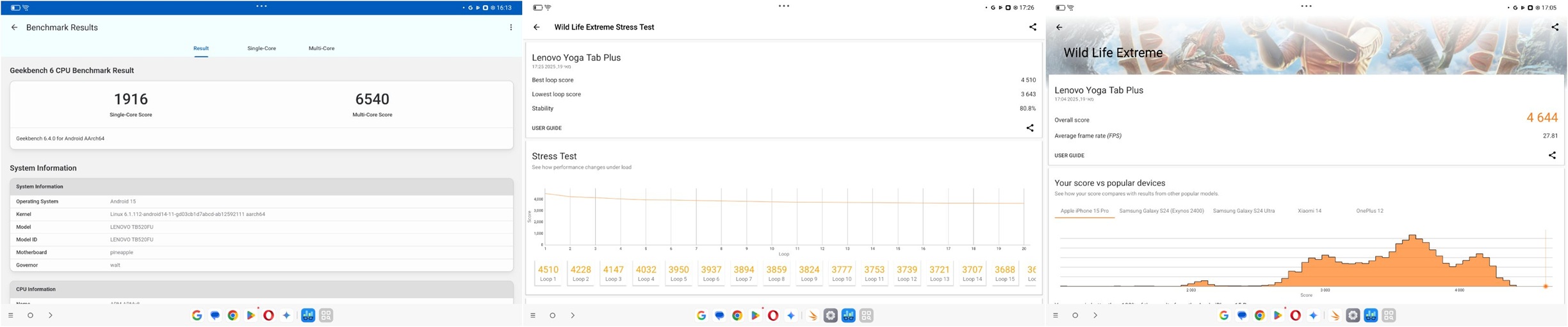 (30% מהציון הסופי)נתחיל מהנתונים על הנייר: מעבד Snapdragon 8 Gen 3, מאיץ גרפי Adreno 750 וזיכרון RAM בנפח 16GB מסוג LPDDR5x. נפח האחסון עומד על 256GB ואינו ניתן להרחבה באמצעות כרטיס זיכרון. במבחני המעבדה קיבלנו תוצאות מצוינות: 6540 נקודות בריבוי ליבות ב-Geekbench ו-4644 נקודות במבחן הגיימינג Wild Life Extreme הן תוצאות מצוינות שמעידות תיאורטית על כך שהטאבלט עומד במשימות תובעניות בהצלחה. מבחינת הביצועים במבחן מאמץ, זה שמעיד על עמידות כרטיס המסך לאורך משימה תובענית וממושכת, בין אם זה משחק או רינדור וידאו למשל, ישנה ירידה מובחנת בביצועים וגם המכשיר מתחמם מאוד במקביל. בסוף מבחן המאמץ הטאבלט הגיע ל-80% יציבות, ירידה דרמטית שמעידה על כך שהתחממות המכשיר פוגעת בביצועים לאורך זמן.
