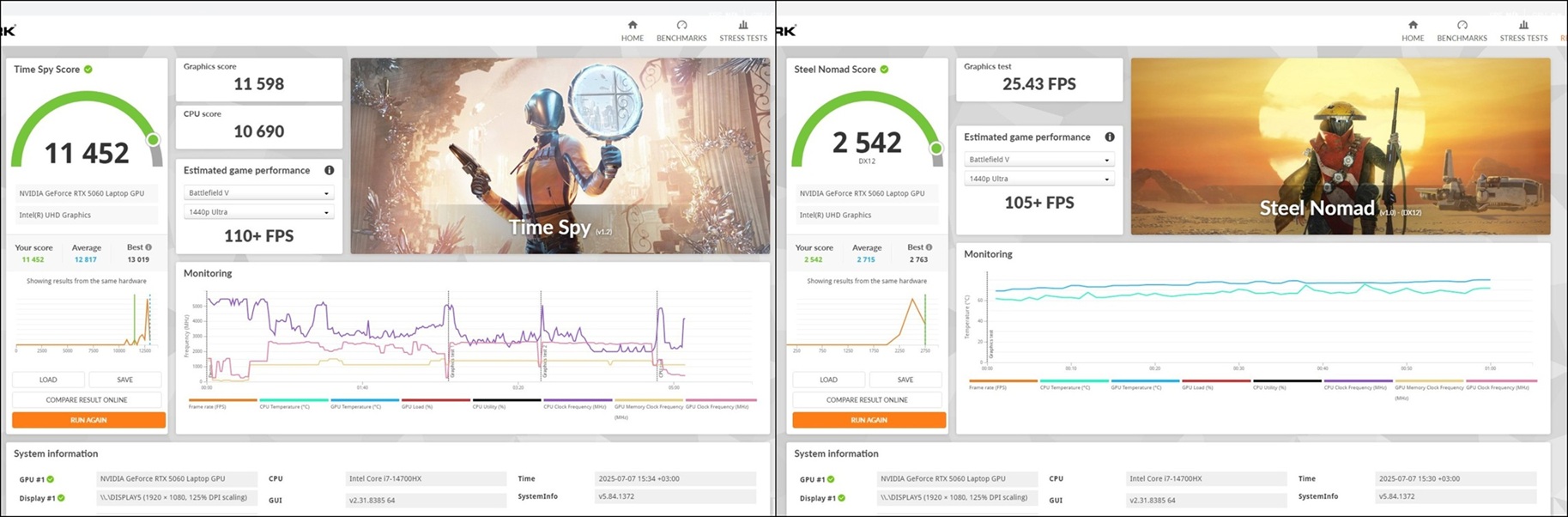 (35% מהציון הסופי)המחשב מצויד במעבד i7-14700HX שהושק בתחילת 2024. הוא עדיין חזק מאוד אבל יש עוצמתיים ממנו, צריך להוסיף. זיכרון ה-RAM בנפח 32GB בתדר 5600Mhz ולצידו כרטיס מסך GeForce RTX 5060 עם זיכרון 8GB. קצת תוצאות ממבחני הביצועים לפני שבודקים גיימינג "מציאותי": ב-Geekbench קיבלנו 16205 נקודות בריבוי ליבות ובמבחני הגיימינג קיבלנו 11452 נקודות ב-Time Spy ו-2542 נקודות ב-Steel Nomad. כל אלה תוצאות טובות שמעידות על כך שמדובר במחשב "עם שרירים", אבל ברור שהתוצאות היו יכולות להיות יותר מחמיאות בהתחשב בכך שמדובר במחשב ייעודי לשחקנים.