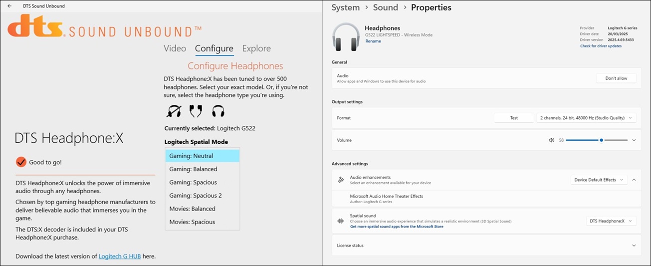 כשתאורת ה-RGB פועלת עם אנימציה בבהירות 100%, חיי הסוללה צונחים דרמטית: המשכנו להאזין באותו שימוש תובעני וכבר תוך יומיים, כלומר בתום 20 שעות שימוש, בסוללה נותרו 30%. כלומר בהערכה, מדובר בסוללה שתציע כ-28–30 שעות, פחות מהבטחת היצרנית. לסיכום, אם התאורה לא קריטית לכם, ה-G522 תציע חיי סוללה פנטסטיים - אבל אם תתעקשו להתהדר בתאורת RGB נוצצת, קחו בחשבון שתדירות הטעינה תהיה תכופה בהרבה.