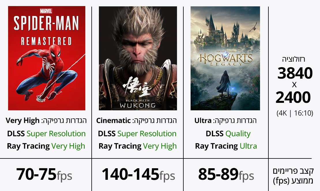 בדקנו על המחשב שלושה משחקים מודרניים ודי תובעניים מבחינה גרפית, בזמן שהמחשב חובר לחשמל והמעבד היה על מצב "ביצועים". את הרזולוציה מתחנו לקצה כמובן, מיקסמנו את הגדרות הגרפיקה, הפעלנו Ray Tracing כדי לאתגר עוד יותר, אבל גם הפעלנו DLSS בשביל ההוגנות.