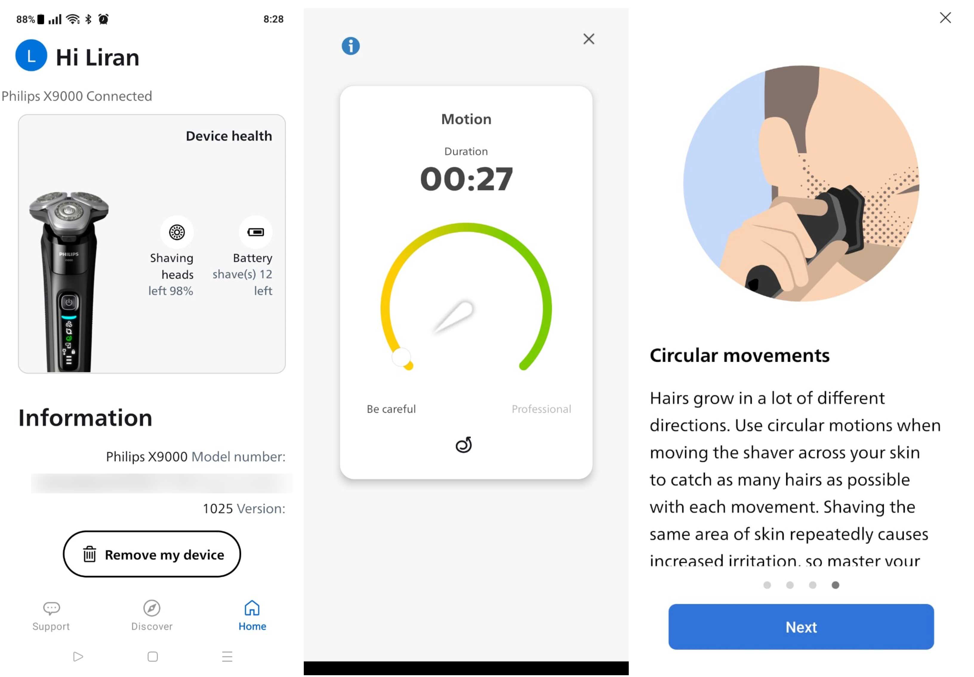 (50% מהציון הסופי)פיליפס מנופפת במה שהיא קוראת לו SkinIQ - "בינה מלאכותית שחשה בעורך ומתאים את עצמה לקבלת דיוק ונוחות אולטימטיביים". בפועל מדובר בחיישני תנועה ועוצמה שיודעים לזהות את כיוון המכונה בעודה מגלחת את עורנו וכן את עוצמת הלחיצה בעת הגילוח. מבחינת שימוש יום-יומי, ה-x9000 שירתה אותנו נאמנה: המכונה חותכת שערות פנים בקלות וברוב המקרים נדרש מעבר או שניים כדי להשיג את התוצאה המבוקשת. כמובן שאחרי שבועיים שלא התגלחנו והשערות הספיקו לצמוח משמעותית, נדרשו כמה וכמה מעברים מעל אזורים גסים יותר כדי לוודא גילוח אחיד. שלא במפתיע מדי, כשהגברנו את תדירות הגילוח והקפדנו על גילוח מדי יום-יומיים, ל-x9000 היה הרבה יותר קל להתמודד עם הזיפים.