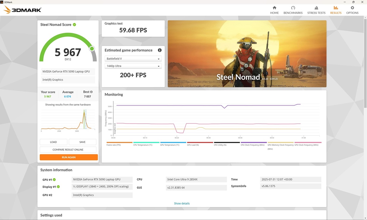 (35% מהציון הסופי)נתחיל מהמפרט: במחשב שולב המעבד Core Ultra 9 285HX מבית Intel שהושק בינואר השנה, עם 24 ליבות, 8 ביצועים (P-Cores) ו-16 יעילות (E-Cores), עם תדר מקסימלי של 5.5GHz ו"כוח" בינה מלאכותית של 36TOPS. לצידו שולב זיכרון RAM בנפח 64GB מסוג DDR5-6400 ונפח האחסון נדיב במיוחד, כ-6TB. על עיבוד גרפיקה תובענית אחראי ה-GeForce RTX 5090 מבית NVIDIA עם זיכרון GDDR7 בנפח 24GB. כלומר על הנייר מדובר במחשב סופר-עוצמתי שלא אמור לגמגם בשום משימת עריכה או גיימינג, גם בכותרים התובעניים ביותר, עם הגדרות גרפיקה מקסימליות.