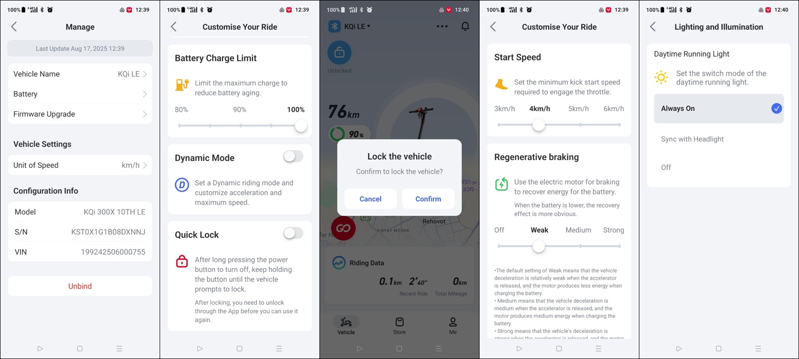 מבחינת אבטחה, אמנם אין לקורקינט פתיחה עם מפתח או כרטיס NFC, פתרון שאהבנו בקורקינט אחר של היצרנית, אבל כן אפשר לנעול אותו דרך האפליקציה, בתמיכת בלוטות'. כל הזזה של הקורקינט לאחר נעילתו תביא לצפצוף קולני, שייכבה רק לאחר פתיחת הנעילה בסמארטפון.