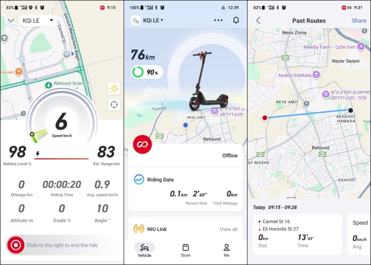 באפליקציה ניתן לצפות אחרי אחוז הסוללה העדכני וההערכת הק"מ הנותר בסוללה, אם כי כאמור, מדובר בהערכה מאוד גסה שלא תמיד תאמה למציאות - כך שצריך לקחת בערבון מאוד מוגבל את ההבטחה שכתובה בסמארטפון. לכאן או לכאן, יופי של חיי סוללה. במקרה האישי שלנו, רכיבה יומית שאורכה מהבית אל המשרד בערך 6 ק"מ לכל צד, רק בבוקר היום החמישי הסוללה החלה לגמגם, שהשפיעה גם על ביצועי הקורקינט. לסיכום, מדובר בטעינה פעם בשבוע - עניין לא מטריח במיוחד.