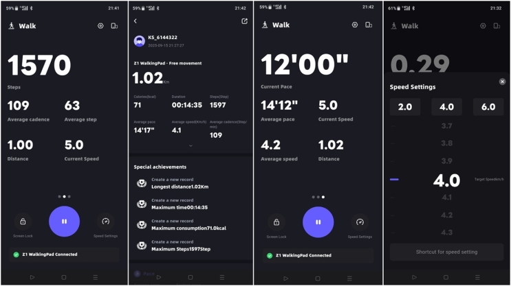 (30% מהציון הסופי)ההליכון נתמך על ידי KS Fit ולמרות שהיא נראית כמו אפליקציה גנרית שתומכת באלפי מכשירי בריאות חכמים, היא התגלתה כיעילה מאוד ונוחה לתפעול. נתחיל מהצימוד שארך בדיוק 20 שניות: מבלי שהתבקשנו להתחבר או להירשם, ה-WalkingPad Z1 זוהה דרך בלוטות', לאחר מכן הגדרנו מגדר, משקל וגובה ויצאנו לדרך. האפליקציה משרתת גם כשלט לכל דבר; אפשר לעצור איתה את ההליכון, לקבוע מהירות ולקבוע קצב הליכה מועדף. אהבנו גם שהתגובתיות של האפליקציה מצוינת ולא איטית יותר מהשלט שקיבלנו במארז. מרשים.
