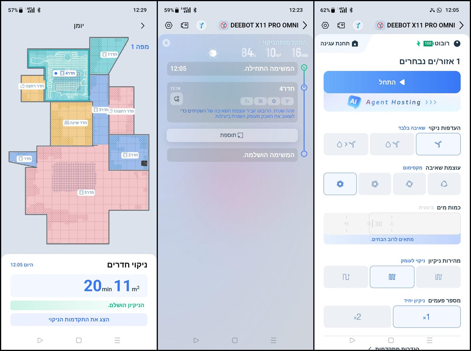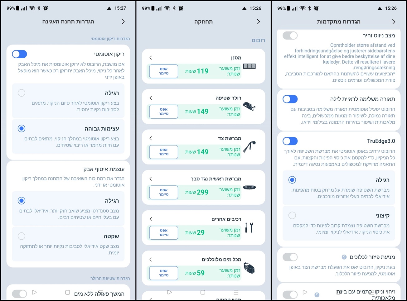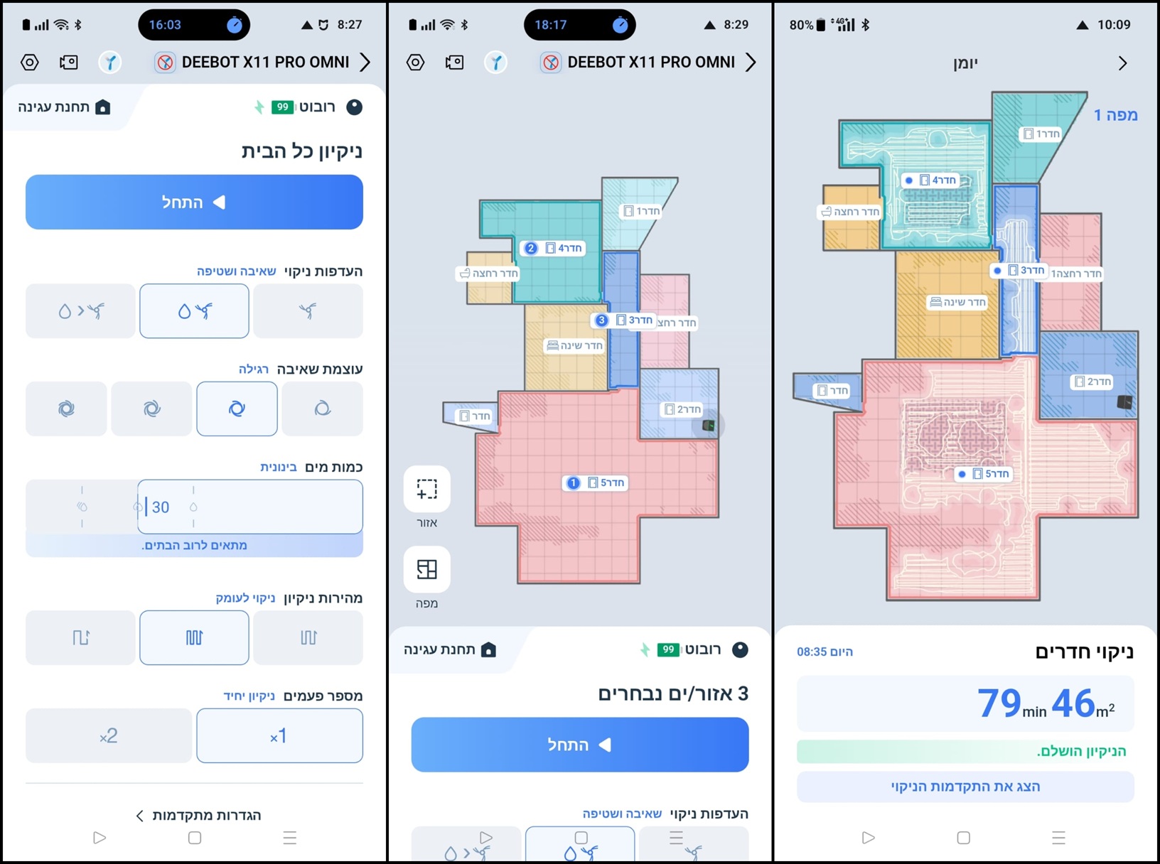 - שאיבת חדר שינה בגודל 11 מ"ר בעוצמה מקסימלית ובשיטת ניקוי לעומק, ארך 20 דקות וניצל 12% סוללה.
