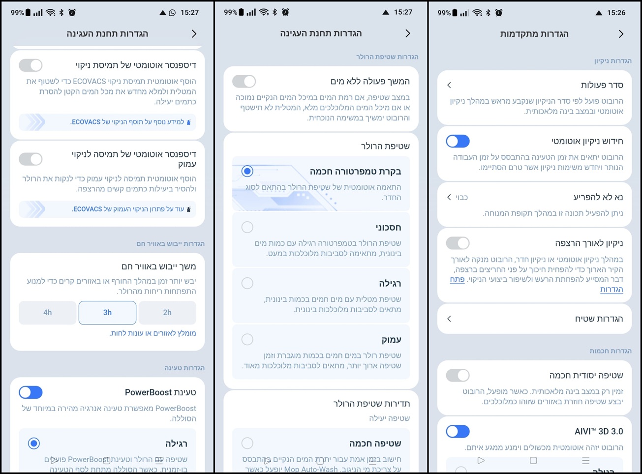 - שאיבה ושטיפה בעוצמה רגילה עם כמות מים בינונית שלושה חדרים בגודל 46 מ"ר, ארך כ-80 דקות וניצל 33% סוללה.