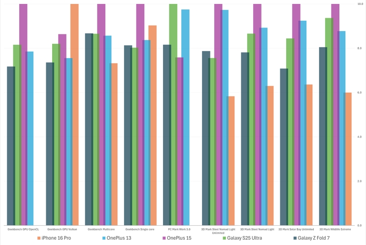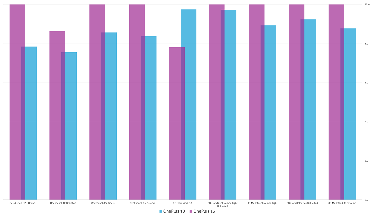 בהשוואה לדגם הקודם - ה-OnePlus 13, מדדנו שיפור ממוצע של 10.6%, עם תוצאות בולטות כמו שיפור של 27% במבחן Geekbench GPU OpenCL המייצג יכולות גרפיות הנפוצות במשחקים, לצד ירידה של כמעט 20% במבחן PCMark Work 3.0 המדמה שימוש יום יומי במכשיר.
