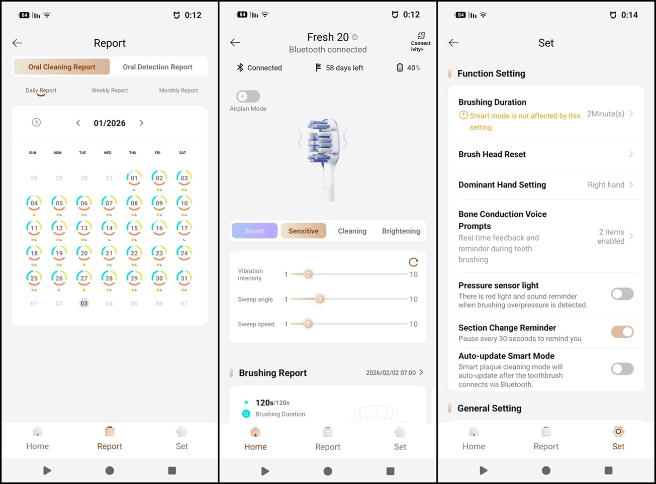 (65% מהציון הסופי)נתחיל מהמידות הפיזיות וה-Fresh 20 Vision מגושם-יחסית בקטגוריה: גובהו 21 ס"מ, רוחבו 2 ס"מ ומשקלו גם מכובד, כ-140 גרם. במרכז המברשת מסך בגודל 0.96 אינץ' שמציג את מצב הצחצוח הנוכחי, משך הצחצוח ורמת הסוללה. מתחתיו צמד לחצנים, העליון מפעיל/מכבה את המברשת, התחתון מחליף בין מצבי צחצוח. בגב המברשת פס תאורה דקיק שמציג קצב ההתקדמות של הצחצוח - תכונה קטנה שאהבנו, שחוסכת לסובב את המברשת כדי לצפות במשך הצחצוח במסך. עוד בקופסה קיבלנו צמד ראשי מברשת, "הלבנה" ו"רגישה", צמד כיסויים, גלאי רובד חיידקיי השן (מצלמה זעירה), כבל טעינה ומעמד.