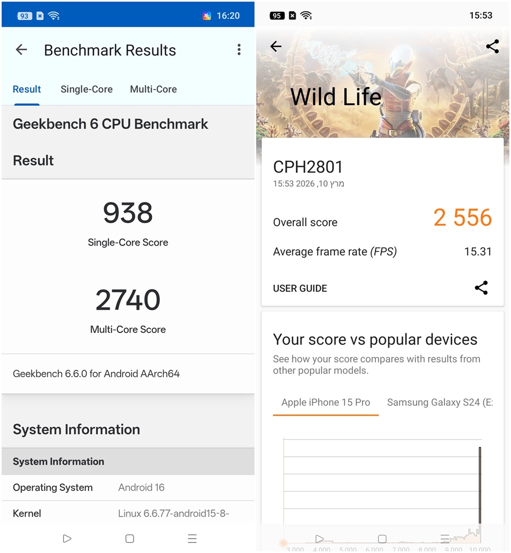 (35% מהציון הסופי)נתחיל ממידות המכשיר. אורכו 15.8 ס"מ, רוחבו 7.5 ס"מ, עוביו 8.1 מ"מ ומשקלו 195 גרם. מסך ה-6.57 אינץ' שומר על גודל סטנדרטי בקטגוריה ויחס גוף/מסך נדיב של 92.8% מותיר שוליים דקיקים ונאים למדי. תצוגת ה-AMOLED זמינה ברזולוציה 1080X2372 פיקסלים, עם פיזור 397ppi וקצב רענון אדפטיבי בתדר של 120 הרץ. עד כאן ראוי לחלק בעיקר מחמאות: תצוגת הלד ממשיכה להרשים, בין אם זה בצפייה בסטרימינג של נטפליקס, בצפייה בתמונות או בעריכת וידאו זריזה. הגוונים מלאים ועמוקים, השחורים ברורים והבהירות, שעומדת על 1400nits במצב בהירות גבוהה, התגלתה כשימושית למדי, גם תחת שמש ישירה. כלומר בכל הנוגע לתצוגה, ה-Reno15 F מגיש חבילה מאוד מהוקצעת.