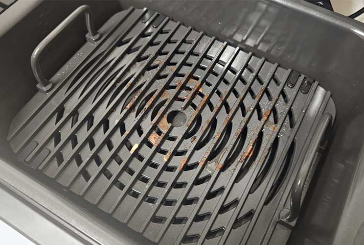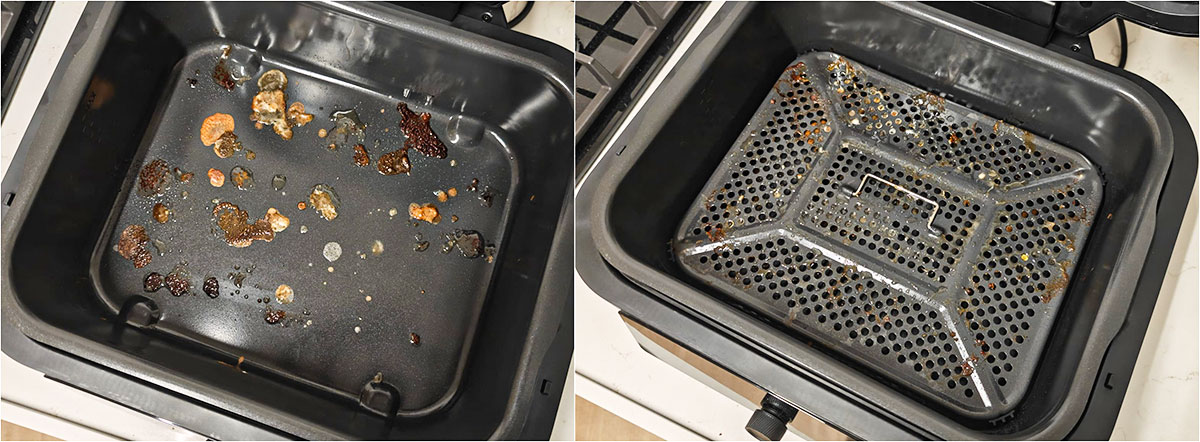 באשר לענייני ניקוי, מטבע הדברים שאריות מזון כמעט תמיד נשארות על האביזרים השונים. ברור שיש הבדל מהותי בכמות הלכלוך שנשאר במכשיר בין דג שנצלה לעומת צ'יפס שטוגן באוויר חם, אבל לכלוך כמעט תמיד נותר בסיר הבישול ובמגש המתחלף.